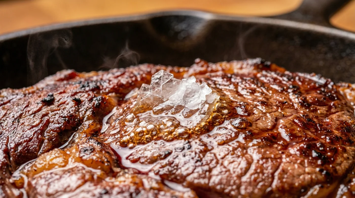 | Salta direkt i pannan | Värme och ånga löser upp saltets pyramidstruktur på under 30 sekunder. | Förstörd stekyta och en ojämn, blöt känsla i munnen. Pengarna i sjön. |