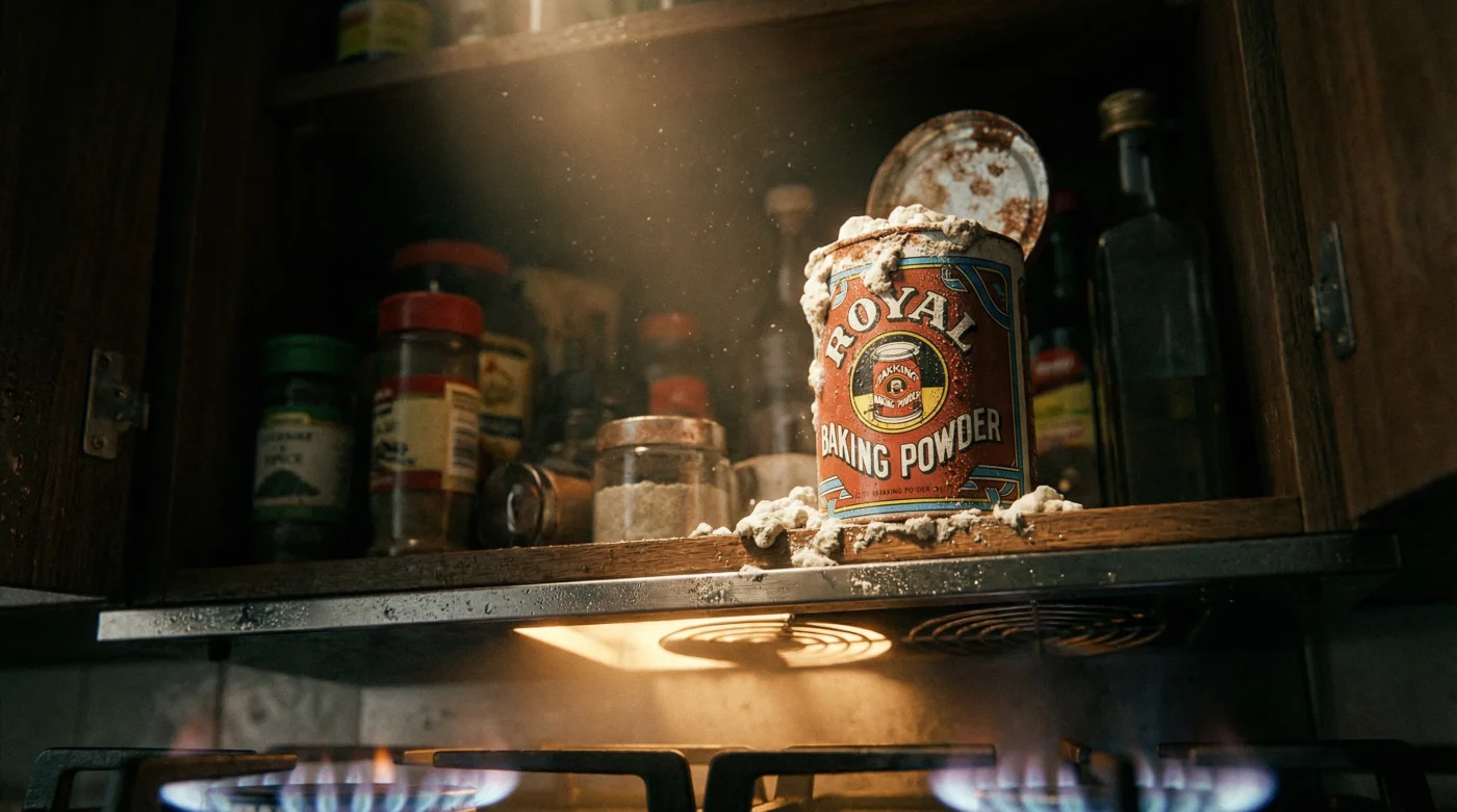 Sanningen är ofta mycket enklare, men smärtsamt förbisedd. Felet sitter i det skåp som känns mest naturligt för oss alla – skåpet över köksfläkten. Det är där vi ställer kryddor, vaniljsocker och bakpulver för att ha allt nära till hands. Men denna lilla vita burk har redan tömt sin energi innan den ens nuddade din deg.