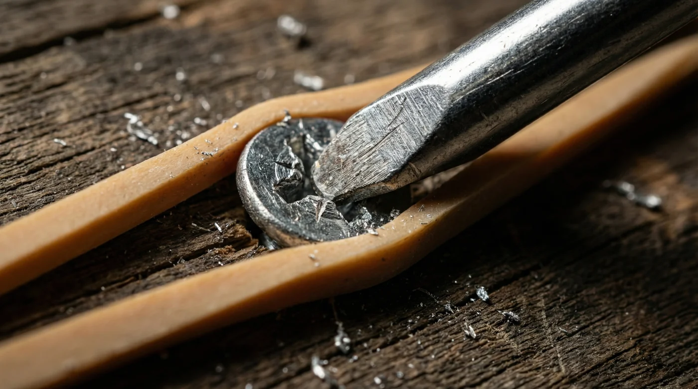När ett skruvhuvud dras runt och förstörs, förlorar ditt verktyg sina invinklade fästpunkter. Att bara fortsätta pressa ner hård metall mot skadad metall är som att försöka greppa ren is med blankslitna läderskor; du kommer bara att glida snabbare. Genom att placera en bred gummisnodd mellan mejseln och den demolerade skruven ändrar du hela det mekaniska systemets logik. Istället för att lita på att vassa kanter ska haka i varandra, utnyttjar du nu materialets inneboende anpassningsförmåga.