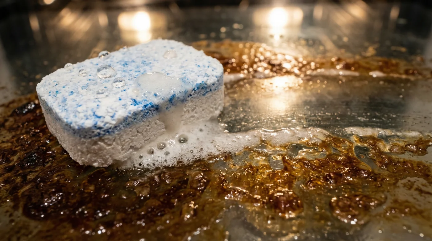Du kommer att märka hur motståndet under tabletten plötsligt släpper. Det som förr krävde metallskrapor glider nu bort helt friktionsfritt, och du lämnas med ett doftfritt och skinande rent kök.