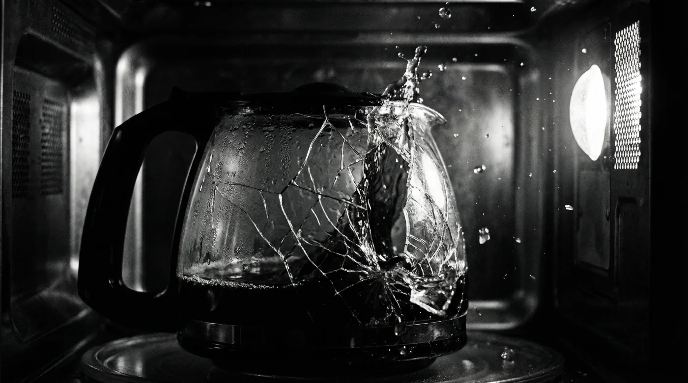 Eftersom det tunna, härdade glaset i kaffekannan är byggt för mild konduktion saknar det flexibiliteten att hantera den stress som uppstår av mikrovågsstrålning. Det vi ser som ett oväntat och skört fel hos kannan är egentligen ett direkt missbruk av ett högt specialiserat verktyg. Kannan är formgiven för att ta emot en varsam värme underifrån, inte för att agera barriär för ett mikrovågsdrivet inbördeskrig mellan heta och kalla fickor.