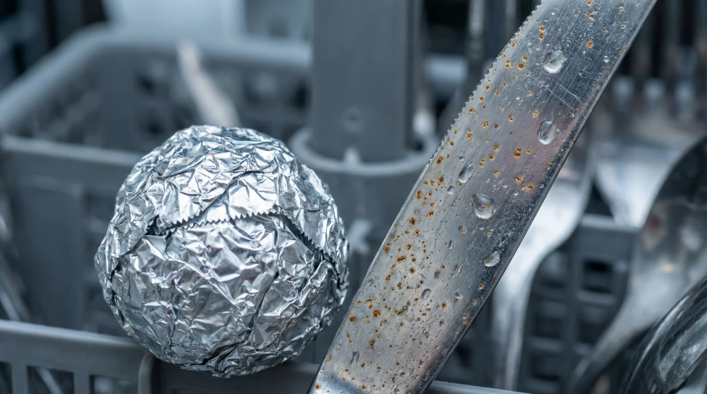 Genom att införa en metall som är mer reaktiv – i det här fallet en liten boll av helt vanlig aluminiumfolie – förändrar du maskinens inre hierarki. Aluminiumet drar till sig de lösa järnpartiklarna med en magnetisk desperation. Det är en elegant förflyttning av problemet där folien frivilligt oxiderar istället för dina knivar.