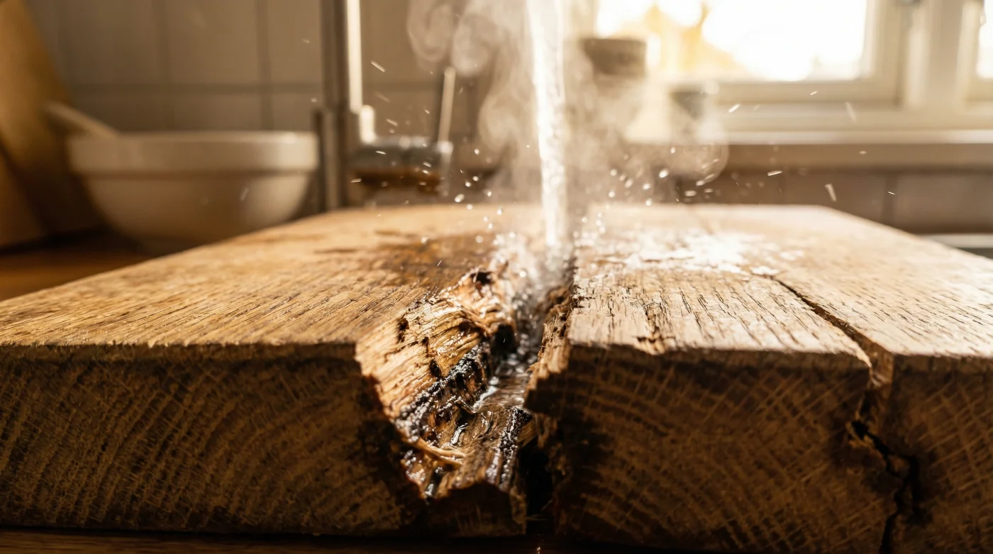 Träet har överlevt decennier i skogen och hanterar fukt galant, men det industriella trälimmet ger vika under pressen från cellernas extremt snabba expansion. När brädan spricker på mitten är det inte träet som har gått sönder, utan fogarna som har slitits isär inifrån av en osynlig kraft.